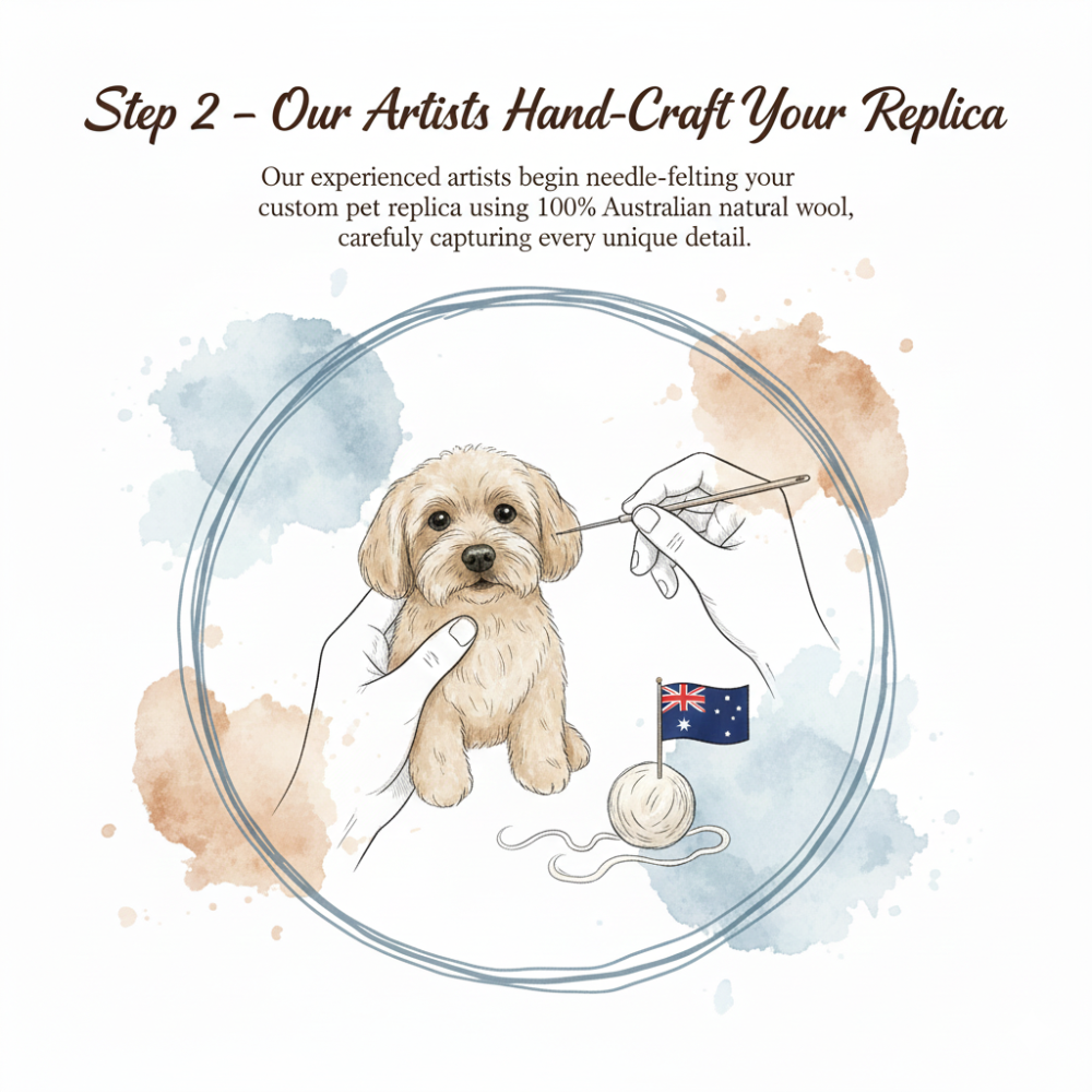 Our experienced artists begin needle-felting your custom pet replica using 100% Australian natural wool, carefully capturing every unique detail.
