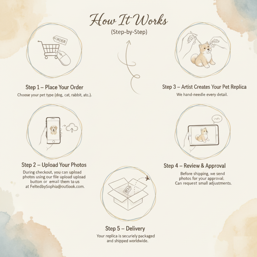 Turn your beloved pet’s photo into a lifelike, hand-crafted wool felt sculpture—100% custom made by professional needle-felting artists.