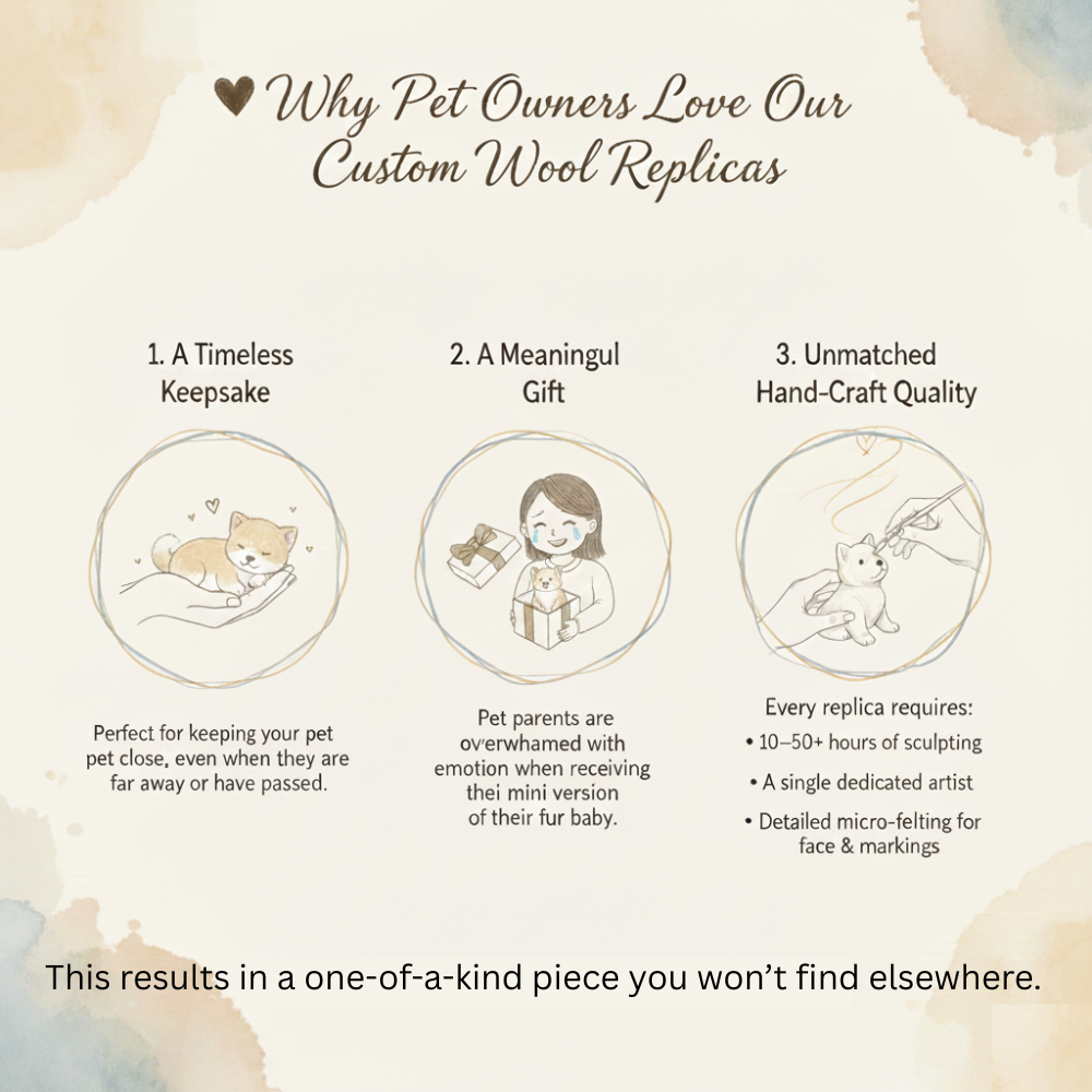 Each replica is sculpted by hand, with premium wool, capturing your pet’s unique charm, personality, and tiny details.
